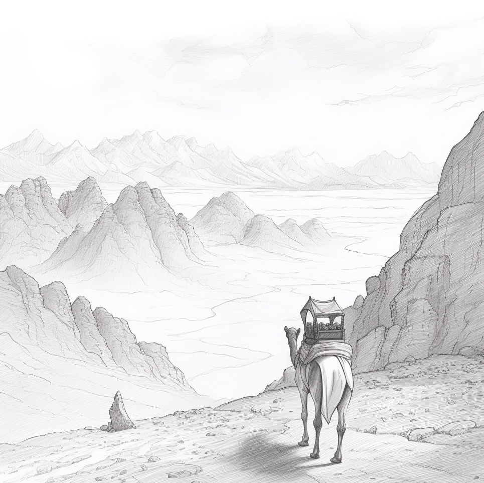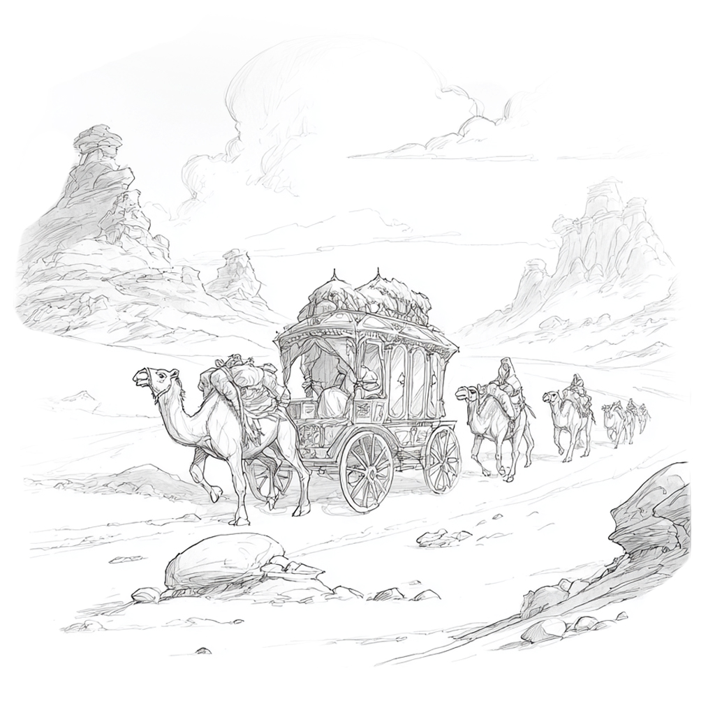 On a caravan route between distant lands, carrying treasures and wisdom through shifting winds